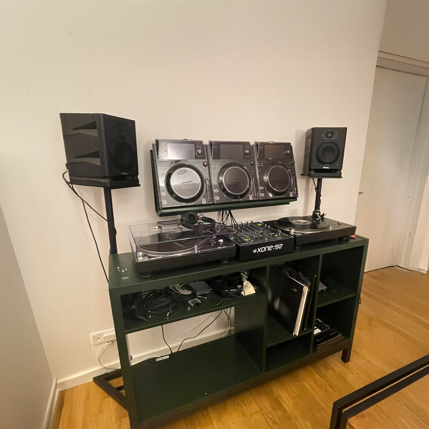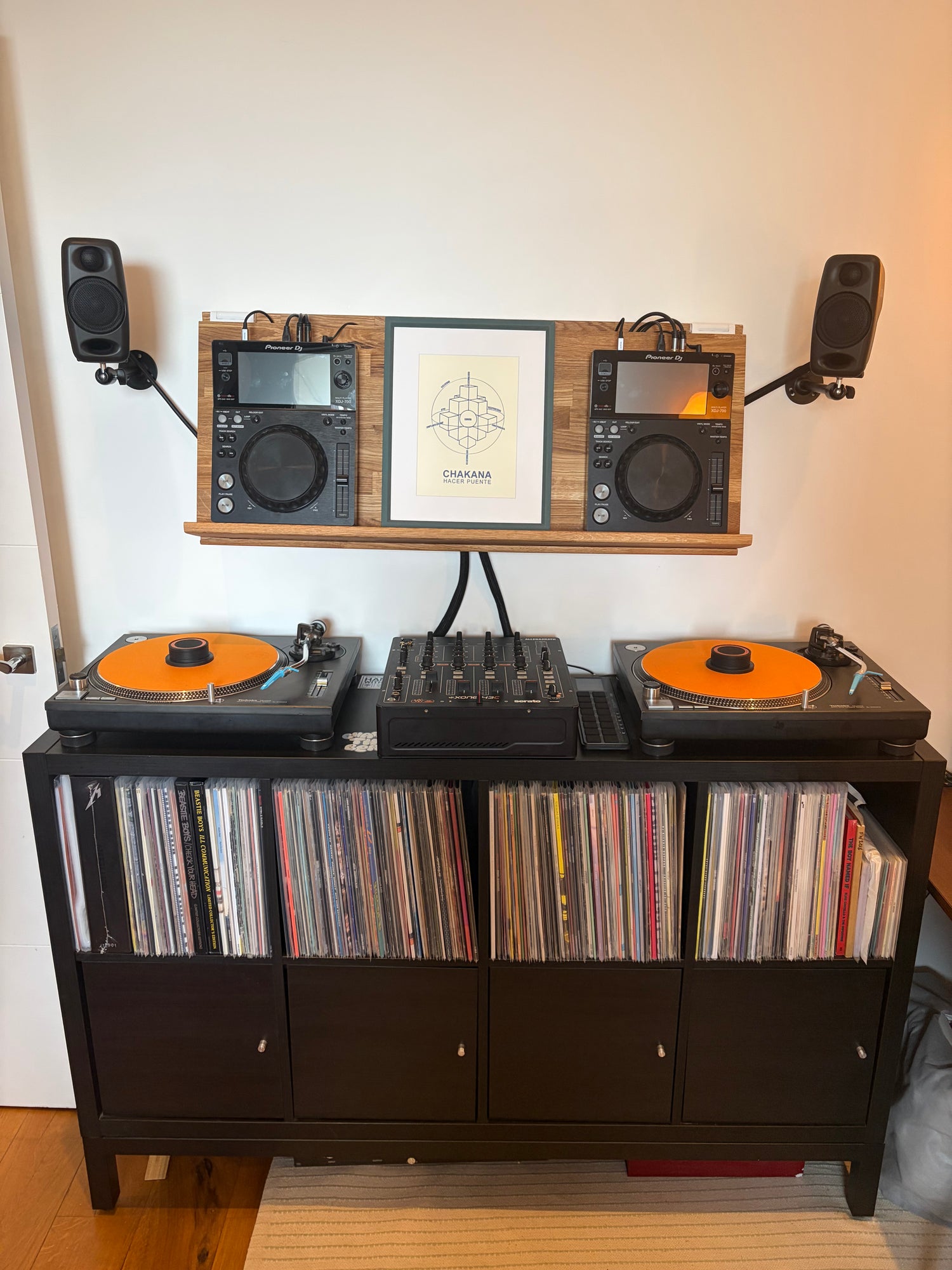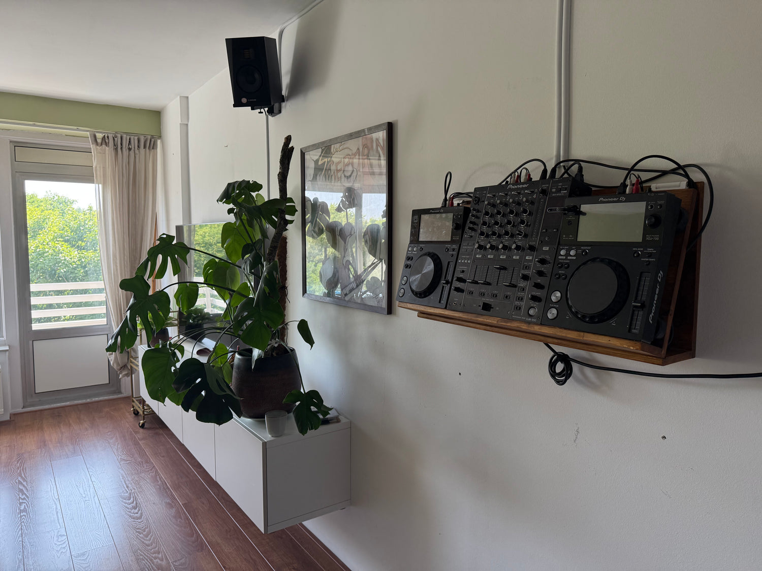 V1-wall mount for 2 x XDJ 700 + Mixer (painted in dark oak)