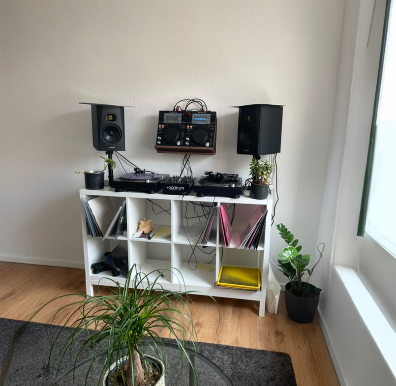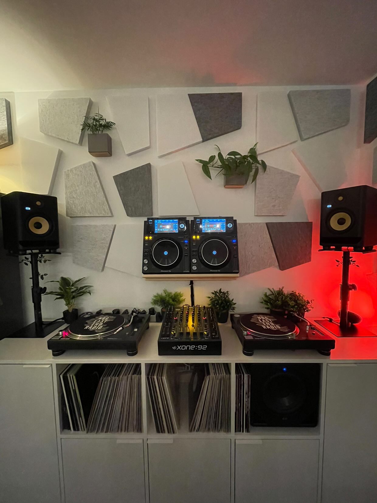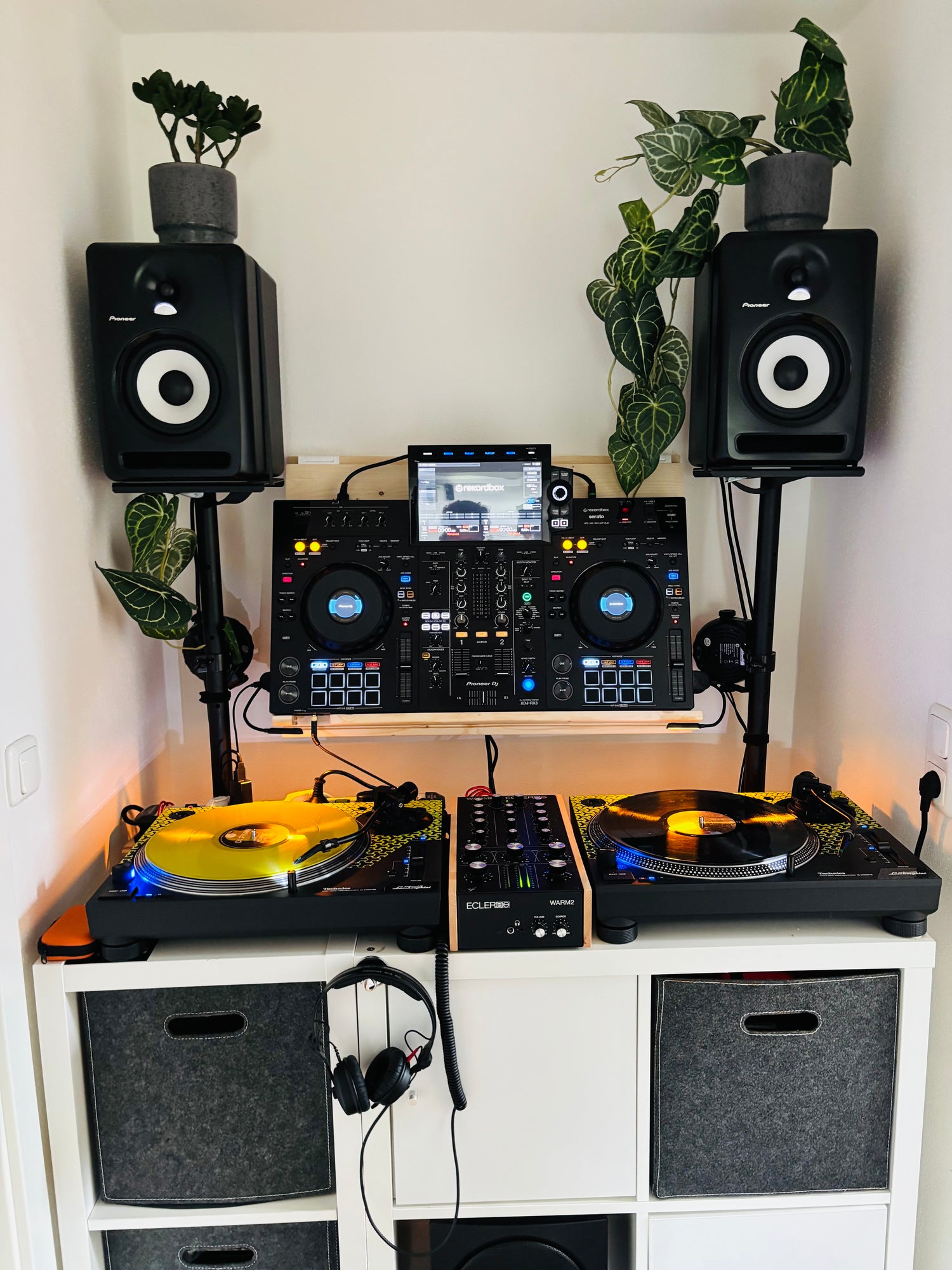 V1-wall mount for 2 x XDJ 700 + Mixer (painted in dark oak)
